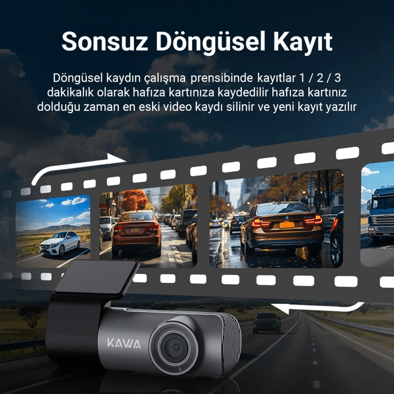 Döngüsel kayıt sayesinde hafıza kartınız dolduktan sonra en eski görüntü silinir ve yeni görüntü karta yazılır.